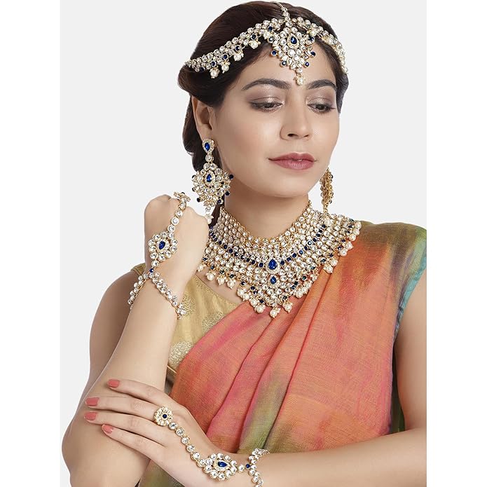 PACKAGE CONTAINS: 1 Choker Necklace, 1 Pair of Earrings, 1 MathaPatti Maangtikka, 1 Pair of Hath Panja, 1 Nathiya